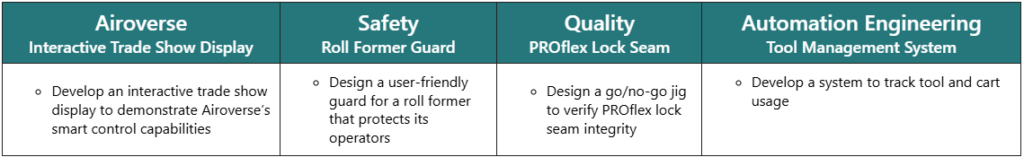 The students worked in groups of two on the following projects, with each tied directly to DMI operations and future initiatives: